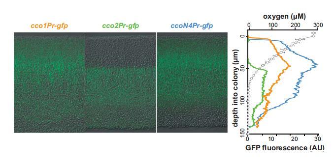 圖4 cco基因隨生物膜深度的不同而表達不同。左圖:從生長了3天的WT生物膜中制備的薄切片的代表性圖像。每個生物膜都在cco1、cco2或ccoN4Q4啟動子的控制下表達轉譯GFP報告基因。報告熒光顯示為綠色,并覆蓋在相應的DIC圖像上。右圖與左側圖像相對應的熒光值。各圖中均減去了含有gfp基因但無啟動子的菌株(空MCS對照)的熒光值。圖中還顯示了生長3天的WT生物膜的O2濃度隨深度變化的情況(開放圓圈)。