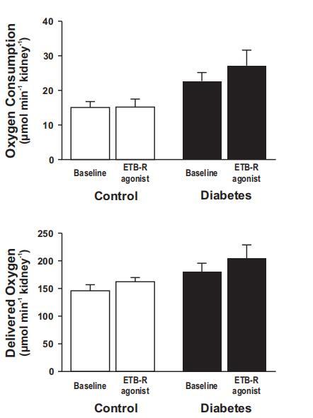 圖3、直接向腎動脈注射B型內皮素受體(ETB-R)激活劑角蝰毒素6c對對照組大鼠(14只)和糖尿病大鼠(9只)腎臟總耗氧量(左圖)和氧輸送量(右圖)的影響。