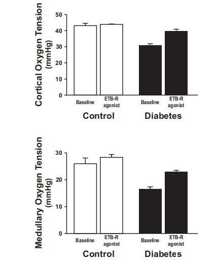 盡管RBF或D˙O2同時增加,但糖尿病腎臟內缺氧是由腎臟總Q˙O2增加引起的(圖3和圖4)。ETB-R激活對糖尿病誘導的Q˙O2增加沒有顯著影響(圖3)。然而,ETB-R激活后,由于總RBF增加,D˙O2明顯增加(圖3和圖4)。有趣的是,皮質和髓質RBF受ETB-R激活的影響不同(圖4)。