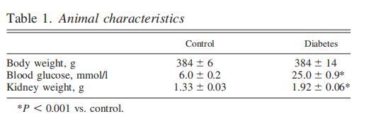 所有注射鏈脲佐菌素的動物都出現了高血糖(表1)。兩組動物的體重相似,而糖尿病動物的腎臟重量增加(表1)。