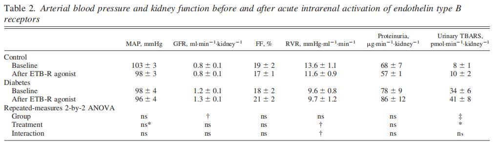 正如之前所報道的,糖尿病大鼠尿液中TBARS的排泄量增加(表2)。有趣的是,ETB-R激活會增加兩組大鼠的尿TBARS。尿蛋白排泄和濾過率均未受影響,而RVR則隨著ETB-R的激活而下降(表2)。