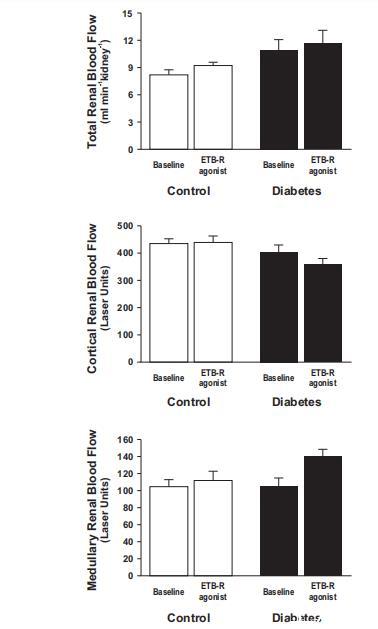 圖4、在對照組大鼠(n=12-14)和糖尿病大鼠(n=9-12)中,將B型內皮素受體(ETB-R)激活劑角蝰毒素6c直接注入腎動脈對腎臟總血流量(左圖)以及皮質(中圖)和髓質腎血流量(右圖)的影響。