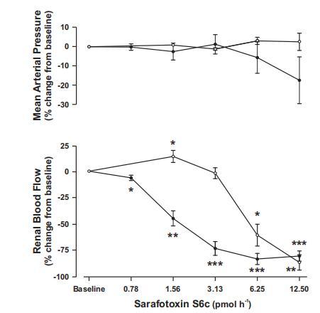 圖1、在正常血糖對照組(白點;n=5)和糖尿病組(黑點;n=8)大鼠的腎動脈中直接注射增加劑量的內皮素B型受體激活劑角蝰毒素6c(S6c)對平均動脈血壓(上圖)和腎血流量(下圖)的急性影響。與組內基線相比,*P=0.05、**P=0.01和***P=0.001。