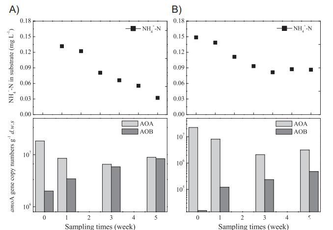盡管糞肥通常是不同化合物的混合物并且富含有機(jī)氮,但糞肥對(duì)AOA和AOB種群的影響似乎與無(wú)機(jī)氮肥類(lèi)似。基于Bray-Curtis距離矩陣的PCA顯示,NH4+-N解釋了環(huán)境數(shù)據(jù)集中96.1%的變異,是決定AOB豐度的最重要化學(xué)參數(shù)。因此,盡管糞肥具有有機(jī)氮的特征,但糞肥中的無(wú)機(jī)氮仍然是影響AOB豐度的關(guān)鍵因素,這通過(guò)NH4+-N與細(xì)菌amoA基因拷貝數(shù)之間的相關(guān)性分析(r2=0.757,p<0.01)得到進(jìn)一步證實(shí)。相反,很難找到糞肥施用與AOA豐度之間的任何聯(lián)系。據(jù)報(bào)道,高比例的無(wú)機(jī)銨供應(yīng)在不同土壤中并未刺激奇古菌氨氧化甚至抑制了它,而AOA的種群受到有機(jī)氮的刺激。因此,AOA豐度的不明確變化可能是糞肥中長(zhǎng)期無(wú)機(jī)和有機(jī)氮供應(yīng)的綜合影響。這一推測(cè)通過(guò)5周培養(yǎng)實(shí)驗(yàn)得到證實(shí)。在唯一的銨底物下,觀察到細(xì)菌amoA拷貝數(shù)的明顯增加,這與先前研究一致,即AOB的豐度在49天和28天培養(yǎng)后增加。