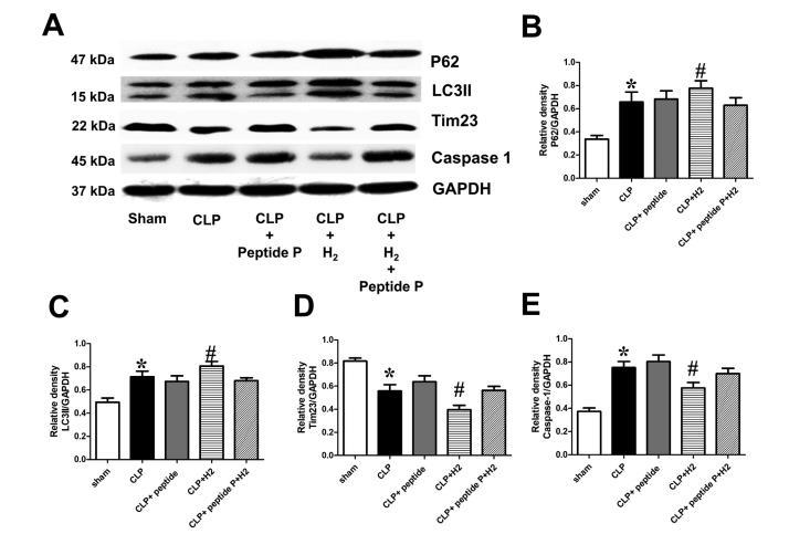 圖7:吸入H2對小鼠P62、LC3B-II、Tim23和caspase-1表達(dá)水平的影響。在假手術(shù)或CLP手術(shù)后6 h收集各組肝臟組織,(A)用western blotting檢測有絲分裂相關(guān)蛋白的表達(dá)。(B)P62,(C)LC3B-II,(D)Tim23,(E)caspase-1的定量分析為測試蛋白相對于GAPDH的密度比。