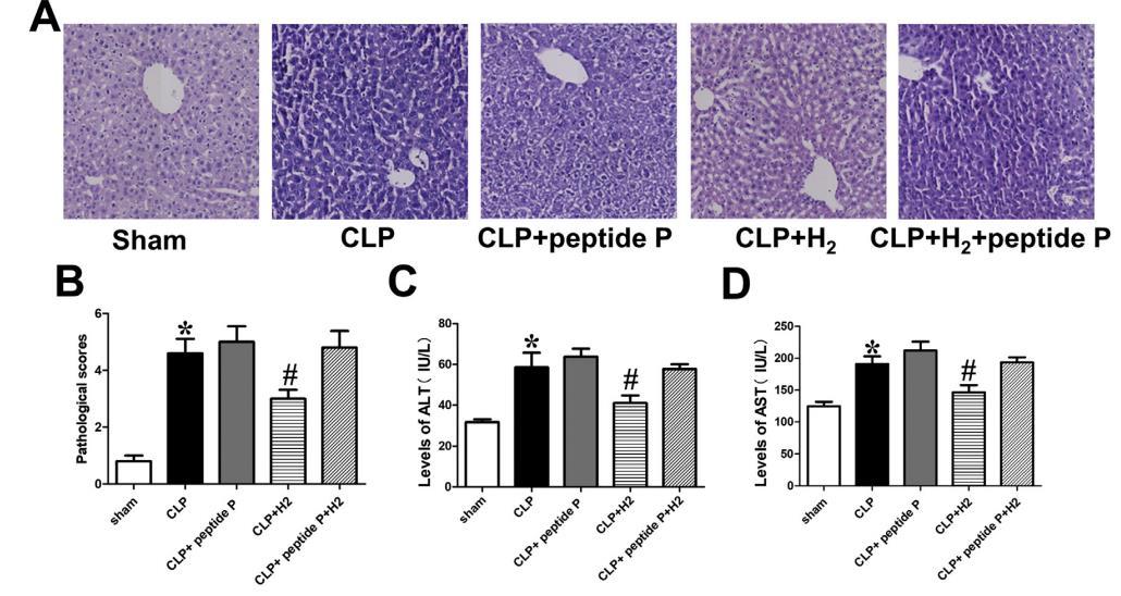 我們使用HE染色法評估假手術(shù)或CLP手術(shù)后6小時肝組織的組織病理學(xué)變化(圖5A)。正常小鼠的肝組織沒有明顯變化。在CLP組,大面積肝小葉出現(xiàn)了與肝損傷相關(guān)的形態(tài)學(xué)變化,包括斑點狀壞死和囊膜炎。然而,與CLP組相比,CLP+H2組小鼠的損傷明顯減輕(圖5B)。此外,血清樣本中的谷丙轉(zhuǎn)氨酶(ALT)和谷草轉(zhuǎn)氨酶(AST)水平也用于評估肝損傷狀況。與假組小鼠相比,CLP組小鼠的谷丙轉(zhuǎn)氨酶和谷草轉(zhuǎn)氨酶水平明顯升高(圖5C和D),而吸入2%H2組小鼠的谷丙轉(zhuǎn)氨酶和谷草轉(zhuǎn)氨酶水平明顯下降(圖5C和D)。然而,CLP+肽P組與CLP+H2+肽P組之間的病理評分和ALT、AST表達(dá)無統(tǒng)計學(xué)差異(圖5B-D)。因此,肽P可以抑制H2對敗血癥小鼠肝損傷的治療作用。