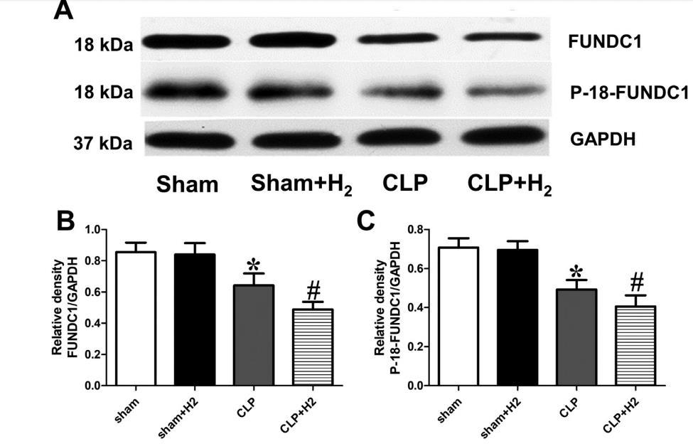 手術(shù)后6小時,用Western印跡法評估FUNDC1和p-18FUNDC1的蛋白水平(圖3A)。盲腸結(jié)扎組小鼠的FUNDC1和p-18-FUNDC1水平低于假組(圖3B-C)。然而,與中性粒細(xì)胞白蛋白組相比,2%H2處理可降低中性粒細(xì)胞白蛋白+H2組小鼠的FUNDC1和p-18-FUNDC1表達(dá)水平(圖3B-C)。