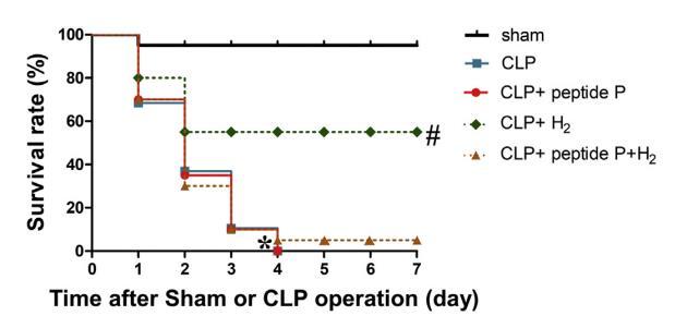 在為期7天的實驗觀察中,假組只有一只小鼠死亡。此外,與假組相比,盲腸結(jié)扎組小鼠的7天存活率明顯下降。與CLP組相比,CLP+H2組在吸入2%H2后的7天存活率明顯提高。然而,CLP+肽P組和CLP+H2+肽P組之間沒有統(tǒng)計學(xué)差異(圖4)。