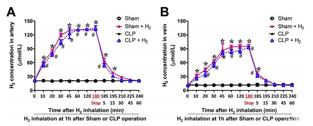 在假手術(shù)或CLP手術(shù)后1 h,分別于H2開始吸入后0、10、20、30、45、60、120、180 min和H2停止吸入后5、15、30、45、60 min,通過氫氣電極測定小鼠(A)動脈血和(B)靜脈血中的H2濃度。
