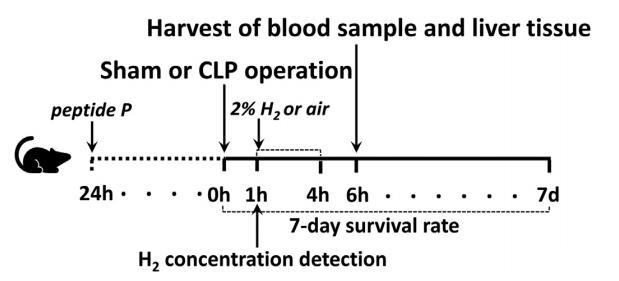 圖1:實驗設計。雄性C57BL/6J小鼠(6-8周大,體重20-25g)接受假手術或CLP手術。我們使用2%的氫氣(H2)或新鮮空氣處理小鼠,從假性或CLP手術后1小時開始,持續3小時。為了驗證FUNDC1的關鍵作用,我們在CLP或假手術前24小時給小鼠腹腔注射細胞穿透肽P(一種FUNDC1抑制劑);其他組則注射相同體積的生理鹽水。在假手術或CLP手術后6小時收集各組小鼠的血清樣本和肝組織。