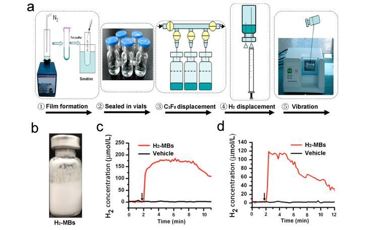 圖1.H2-MBs的制備和表征。(a)H2-MBs制備的示意圖。將由DSPC和DSPE-PEG2000(摩爾比=90:10)組成的15毫克磷脂混合物溶解在氯仿中。在形成膜和水合后,將含水分散液(脂質體)裝入4 mL瓶中(每瓶1 mL),并用八氟丙烷(C3F8)置換瓶中的空氣。隨后,顛倒瓶子,并用注射器注入一定量的H2。因此,瓶子中擠出相等體積的C3F8。震動45秒后獲得H2-MBs。(b)從上述方法中獲得的H2-MBs的代表性圖像(C3F8/H2比為1:1)。(c、d)體內外H2釋放的代表性時間曲線。