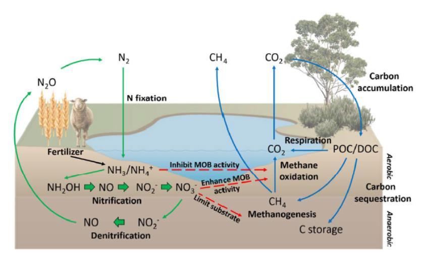圖1、濕地的碳氮循環(huán)。綠色箭頭表示N-循環(huán)進(jìn)程,藍(lán)色箭頭表示c-循環(huán)進(jìn)程。增加水位促進(jìn)了電子受體的可用性(即NO3