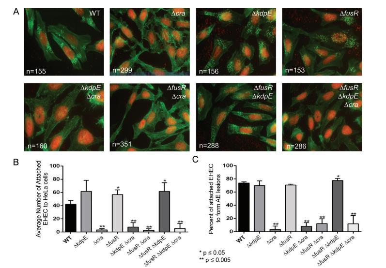 由于Cra、KdpE和FusR影響LEE基因表達(這是AE病變形成所必需的),我們接下來評估了這些轉(zhuǎn)錄因子在AE病變形成調(diào)控中的作用。為了形成AE病變,EHEC使用專門效應(yīng)器緊密附著哺乳動物細(xì)胞并重組肌動蛋白以包裹細(xì)菌,形成pedestal樣結(jié)構(gòu)。為了assay刪除cra、kdpE或fusR(單獨或組合)是否影響EHEC AE病變形成,感染HeLa細(xì)胞并評估形成的AE病變數(shù)量和每個病變附著的細(xì)菌數(shù)量。與WT細(xì)菌(41.99±5.46)相比,ΔfusR(56.74±7.11)和ΔfusRΔkdpE(61.52±13.07)菌株顯著更多細(xì)菌附著HeLa細(xì)胞,分別有73.68%、70.67%和77.44%的附著細(xì)菌能夠形成AE病變(圖1A至C)。任何刪除cra的菌株附著HeLa細(xì)胞或與AE病變相關(guān)的細(xì)菌數(shù)量顯著減少。雖然ΔkdpE菌株有更多附著細(xì)菌(61.56±16.74),69.86%形成pedestals,與WT相比,這些數(shù)據(jù)不顯著。總體而言,這些數(shù)據(jù)表明Cra是EHEC中AE病變形成的強激活劑;然而,單獨刪除fusR或與kdpE組合顯示這些調(diào)節(jié)器在EHEC附著HeLa細(xì)胞前抑制或改變AE病變形成的動力學(xué)。