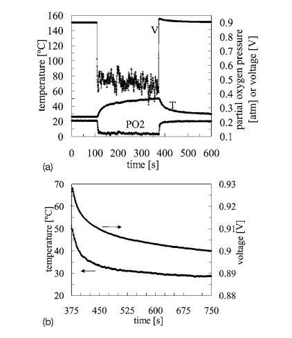 瞬態(tài)測量—圖11a顯示了在0和333~mA/cm^2之間的電流中斷脈沖循環(huán)期間記錄的電壓、溫度和PO2瞬態(tài)。在大約375~s時發(fā)生的電壓瞬變在圖11a的尺度上難以分辨,因此在圖11b中提供了放大版本。圖11b中的氧氣瞬變可以擬合到一個單指數(shù)模型,時間常數(shù)tauO2sim 6~s。這個短的、單一的時間常數(shù)可能與邊界層中的O2擴散有關。相比之下,溫度瞬變需要用指數(shù)項和線性項進行擬合。指數(shù)項(tauTsim 20~s)可能與燃料電池本體的熱質(zhì)量以及熱邊界層的建立有關。線性項(sim 0.19^circC/min)是由陰極持續(xù)積水導致氣體擴散層傳質(zhì)損失增加,進而引起電池自加熱增加引起的。如果液態(tài)水從陰極表面連續(xù)去除,則不存在該線性項。