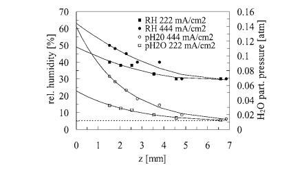 圖12顯示了在相同的電流負載循環(huán)條件(在0和333 mA/cm2之間)下測量的RH和PH2O瞬態(tài)。雖然RH信號顯示非常小的瞬態(tài)響應,但PH2O響應在恒定電流負載下顯示出較大的變化。PH2O瞬變的初始部分可以用指數(shù)函數(shù)近似,得出時間常數(shù)TH2O~14 s。這個時間常數(shù)基本上反映了濕度傳感器的上升時間,因此初始PH2O瞬變時間尺度的精確測量未能實現(xiàn),但我們可以將其值限定在小于約14 s。隨后PH2O隨時間增加的速度要慢得多,并且是非指數(shù)性質(zhì)的。這種響應表明陰極表面有液態(tài)水積聚,如先前所述。當電流在t~1500 s中斷時,PH2O迅速恢復到環(huán)境條件,同樣具有約14 s的弛豫時間。(然而這次請注意,PH2O信號沒有表現(xiàn)出次要的線性分量。)另一方面,RH響應顯示出有趣的超調(diào)行為。最可能的是,這種超調(diào)與濕度傳感器固有響應時間的限制有關(參見濕度傳感器校準部分)。為完整起見,我們注意到,這種超調(diào)也可能是由于水生產(chǎn)立即中斷與電池溫度緩慢下降之間的時間滯后造成的。由于這種滯后,陰極上方仍然溫暖的空氣將經(jīng)歷RH的突然下降,隨著電池(和周圍空氣)冷卻下來,RH presumably會恢復。