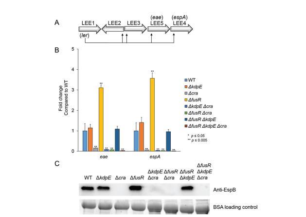 AE病變形成依賴于LEE基因表達,先前研究在有氧糖異生生長條件下顯示Cra和KdpE激活而FusR抑制LEE基因轉錄。然而,Cra、KdpE和FusR之間的潛在交叉對話尚未被研究。為了assay刪除cra、kdpE或fusR(單獨或組合)是否影響LEE基因轉錄,突變體在有氧低葡萄糖和丙酮酸培養基中生長(與上述assay相同培養基)。測量代表兩個LEE操縱子eae和espA的基因表達。Δcra、ΔkdpEΔcra、ΔfusRΔcra和ΔfusRΔkdpEΔcra菌株顯著降低LEE基因表達(圖2B)。ΔkdpE和ΔfusRΔkdpE突變菌株的LEE基因表達水平略高于但相似于WT,而ΔfusR菌株顯著增強LEE基因表達。為了確認我們的定量逆轉錄(qRT)-PCR數據,使用Western blot assay測量LEE編碼的效應器EspB的分泌(其與espA在同一LEE4操縱子中編碼)(圖2C)。綜合來看,這些數據再次表明Cra在這些生長條件下強烈激活LEE表達而FusR抑制它。在三個調節器中,Cra對LEE基因表達的影響最主導。