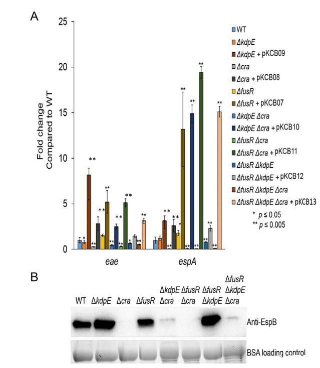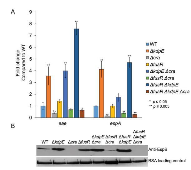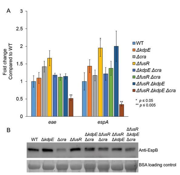 由于丙酮酸是一個關鍵中心代謝物且Cra活性依賴于糖異生條件的感知,單突變、雙突變和三突變菌株在有氧僅低葡萄糖中生長以去除丙酮酸作為潛在混淆變量。獨立于丙酮酸,Cra仍然在Δcra、ΔkdpEΔcra、ΔfusRΔcra和ΔfusRΔkdpEΔcra菌株中顯著降低eae和espA表達(圖3A)。eae表達在ΔkdpE菌株中也顯著降低,而espA表達未變(圖3A)。這些結果與我們先前報告一致。EspA在LEE4操縱子中編碼,其表達受高水平轉錄后調控,包括RNA結合蛋白CsrA。