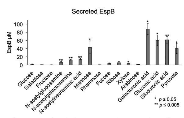 給定WT EHEC與不同黏蛋白衍生糖的世代時間差異,我們接下來問這些不同糖是否影響LEE編碼蛋白EspB的表達。WT EHEC和ΔespB突變菌株在微氧條件下生長到早期穩定期before生長停止。在所有測試糖中,ΔespB突變菌株生長類似WT EHEC。如預期,WT EHEC在高葡萄糖條件下表達低濃度EspB(圖8)。當半乳糖、果糖、rhamnose、巖藻糖、核糖、木糖或阿拉伯糖作為唯一碳源時也觀察到低EspB產生。當galacturonic acid、gluconic acid、glucuronic acid、丙酮酸、唾液酸或甘露糖作為唯一碳源時,EspB分泌substantially增加。當N-乙酰葡萄糖胺和N-乙酰半乳糖胺使用時觀察到EspB分泌適度增加。這些數據證明利用至少八種替代糖由EHEC可以促進毒力基因的表達和分泌。