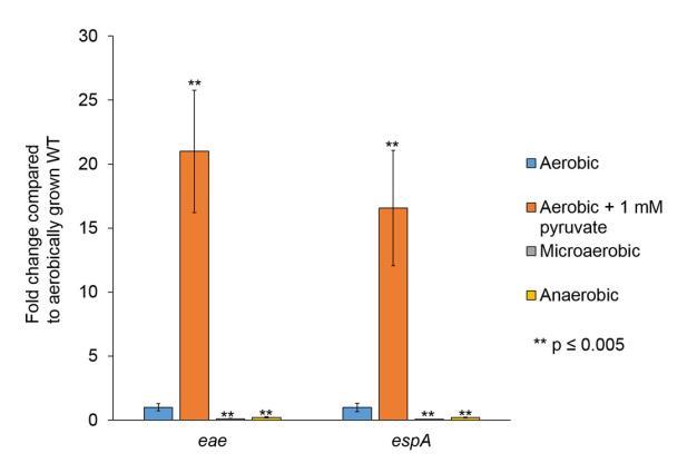 除了丙酮酸和糖源在LEE基因表達中的作用外,腸道中的氧氣可用性從腸腔到上皮表面變化。我們接下來問LEE基因轉錄是否在厭氧或微氧條件下改變。腸腔(EHEC遇到的第一個位點)主要是厭氧的。由于更少細菌存在near上皮頂表面,氧氣可以擴散穿過腸細胞,創建微氧環境。最近,顯示微生物群也可以影響腸道中的氧氣可用性。此外,Citrobacter rodentium(廣泛用作EHEC鼠類感染替代模型)通過LEE編碼的T3SS活性觸發結腸增生,增加黏膜表面氧合,導致C.rodentium有氧擴張。EHEC和C.rodentium緊密附著腸細胞在一個可能從微氧變為有氧的環境中。LEE基因表達在厭氧條件下(在厭氧室中生長)被抑制,而在有氧條件下增強,并在有氧加丙酮酸條件下達到更高水平(圖5)。