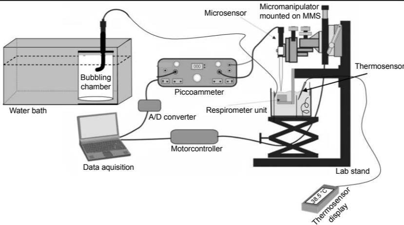 超微呼吸系統由一個氧氣微傳感器(OX50;尖端直徑40-60μm)組成,這是一種微型克拉克型氧傳感器,90%響應時間小于5秒,且氧氣消耗可忽略不計。傳感器安裝在電動微操縱器(MM33)上,牢固附著在穩定的實驗室支架(LS18)上,并連接到高靈敏度皮安計(PA2000),能夠以0.1μmol/l的分辨率記錄來自氧氣傳感器的信號。然而,此類傳感器信號對溫度變化略微敏感(每攝氏度信號增加2-3%)。皮安計通過A/D轉換器(ADC-101)連接到運行數據采集軟件(Profix版本2.2)的計算機。該軟件用于讀取和記錄來自微傳感器的數據,并通過電機控制器(MC-232)控制微操縱器。