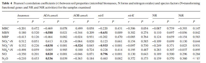 使用Pearson相關系數來識別不同比例CAW施用后土壤特性與氮轉化功能基因之間的關系。AOA amoA基因拷貝數與土壤MBN(r=-0.588,P<0.05)和NO??-N(r=-0.838,P<0.01)呈負相關,而AOB amoA基因拷貝數與土壤MBC(r=0.546,P<0.05)呈正相關,與土壤NO??-N(r=-0.524,P<0.05)呈負相關。nirS基因拷貝數與土壤MBN和NO??-N呈負相關(分別為r=-0.651和-0.933,P<0.01)。平均土壤NO濃度與AOA amoA和nirS基因的豐度呈正相關(分別為r=0.820和0.796,P<0.01),平均N?O含量與AOA amoA基因豐度呈正相關(r=0.536,P<0.05)。NR和NiR活性與土壤特性之間沒有顯著相關性。