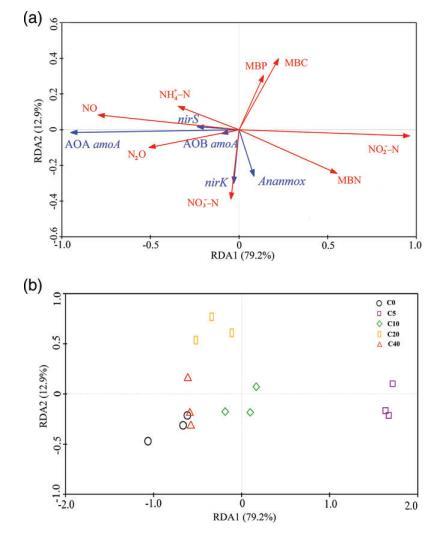 基于相關程度,選擇CAW改良后的土壤變量進行RDA,并匯總功能基因豐度。選定的土壤變量為MBC、MBN、MBP、NO??-N、NO??-N、NH??-N、NO和N?O。表S6(支持信息)給出了RDA前四個軸的特征值,按大小降序排列。前兩個軸分別解釋了基因豐度變異的79.2%和12.9%。RDA雙標圖表明,土壤特性的差異影響了CAW施用下氮轉化微生物功能基因的豐度。圖4(a)中紅色箭頭的長度表示每個土壤因子在解釋功能基因豐度方面的相對重要性,而箭頭之間的角度表示它們相關的程度。土壤NO??-N和NO與RD1關系密切,分別在該軸上具有最大正值和負值(分別為0.9632和-0.7954),而土壤MBC和NO??-N在RD2上分別具有最大正值和負值(分別為0.3976和-0.3890)。