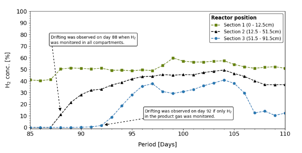 圖5、在第88天時,通過氫氣微傳感器檢測到了滴流床反應器中酸化的早期預警信號,隨后在第92天實現了完全酸化,這導致了產品氣體質量的下降。每個數據點代表了1440次測量的平均值。