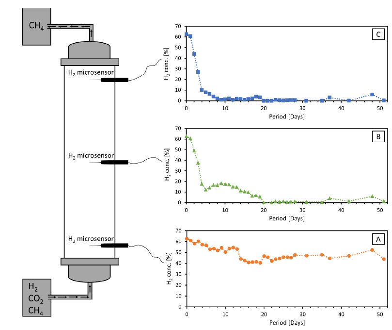 研究簡介:生物甲烷化是一種新興的Power-to-X技術,通過可再生氫氣將CO2轉化為生物甲烷,對實現碳中和目標具有重要意義。滴床反應器(TBR)作為促進生物甲烷化的理想反應器類型,傳統上采用"黑箱"方法進行操作,僅基于進料和出料特性描述系統性能,難以捕捉反應器內部動態變化。本研究創新性地在TBR垂直軸線上安裝多個氫氣微電極,實現了對反應器內部動力學的實時在線監測。研究在集成到全規模沼氣廠的10L TBR中持續進行135天,通過監測不同高度的H2濃度分布,揭示了反應器內部的垂直分層現象。盡管整體CH4生產力達到12.6 L L-1 d-1,但垂直剖面分析顯示局部區域(靠近氣體入口)的CH4生產力高達54.8 L L-1 d-1,而反應器上部區域活性顯著降低,證實了TBR內部存在明顯的功能區劃。