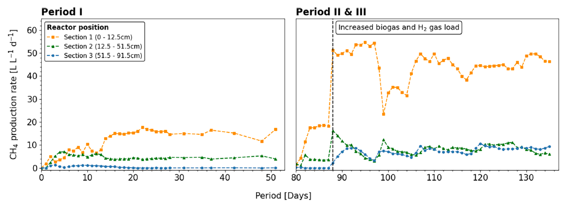 圖3、TBR第1節(0–12.5厘米)、第2節(12.5–51.5厘米)和第3節(51.5–91.5厘米)的本地CH4產能時間序列數據(基于連續H 2傳感器及定期氣體成分和流量測量),使用沿垂直軸的傳感器測量,運行期為135天。每個數據點平均代表1440次測量(每分鐘1次測量)。