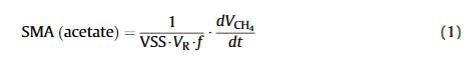特異性產(chǎn)甲烷活性(乙酸)=(1/(揮發(fā)性懸浮固體·反應(yīng)器體積·f))·(dV_CH4/dt)
