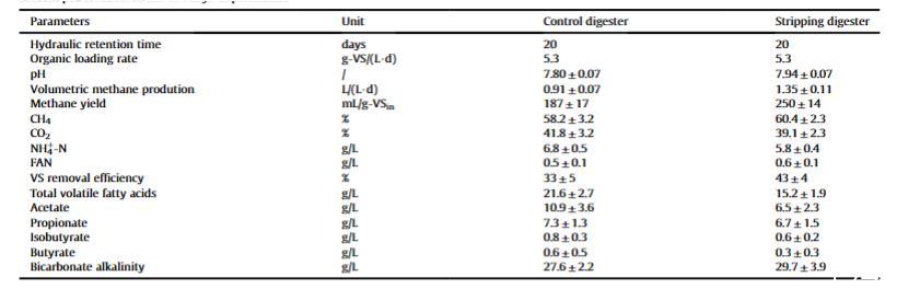 兩個消化器的過程性能如表2所示。對照消化器和剝離消化器中的總銨態(tài)氮濃度分別為6.8和5.8 g/L。通常,氨/銨抑制反映在揮發(fā)性脂肪酸積累和甲烷產(chǎn)率降低,發(fā)生在總銨態(tài)氮3-5 g/L。在本研究中,兩個消化器均觀察到揮發(fā)性脂肪酸積累,然而,剝離消化器中的揮發(fā)性脂肪酸濃度僅為對照消化器的70%。