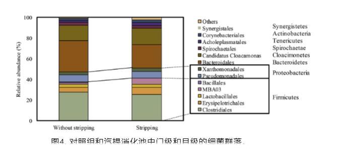 第二豐富的細菌屬屬于Bacteroides sp.(B.cellulosilyticus和B.gallinarum),它們的相對豐度在剝離過程中顯示明顯變化(與對照相比增加27%)。Bacteroides屬成員的代謝多樣性/靈活性及其在可變環(huán)境因素下的適應(yīng)能力先前已被報道。同樣,屬Fermentimonas(特別指F.caenicola)的相對豐度在剝離反應(yīng)器中增強了2.3倍。F.caenicola最近被建議參與過程的水解和酸化階段。另外,物種Clostridium caenicola和C.populati的相對豐度在剝離消化器中也分別增強了1.8和2.2倍。這些物種能夠利用不同類型的碳水化合物、纖維素和其他糖類生產(chǎn)氫、CO2和揮發(fā)性脂肪酸。因此,可以結(jié)論,剝離過程可以增強厭氧消化的不同子階段,導(dǎo)致更多產(chǎn)甲烷底物可用于甲烷生產(chǎn)。