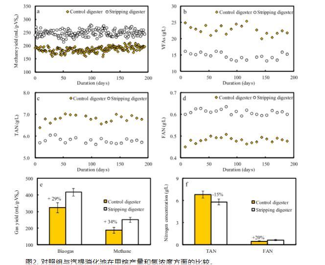 兩個消化器連續(xù)運行194天。如圖2所示,與對照消化器相比,剝離消化器中的總銨態(tài)氮濃度降低了20%。隨著這種降低,剝離消化器中的沼氣和甲烷產(chǎn)率分別比對照消化器高29%和34%。據(jù)報道,在總銨態(tài)氮2.1 g/L和投料總固體5%時,雞糞的甲烷產(chǎn)率更高為310 mL/g-VS。因此,仍需要進一步優(yōu)化以去除更多氨氮并增加甲烷生產(chǎn)。