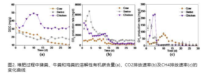 CO?排放速率的演變表明,三種畜禽糞便的礦化速率隨堆肥時間顯著下降。前15天內,豬糞的CO?產生速率降低了90.4%,雞糞降低了85.6%,牛糞降低了81.6%。這一結果可能與可用有機物含量和水分減少有關。整個測試期間,豬、雞和牛糞的CO?累積排放量分別為62.0 g、41.9 g和16.9 g。