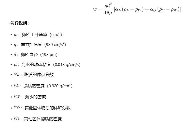 其中 w 為上升速率(厘米/秒),g 為重力加速度(980 厘米/秒2),d 為卵直徑(198 微米),μ 為海水動力粘度(0.018 克/厘米·秒),αL 為脂質體積分數,ρL 為脂質密度(0.920 克/立方厘米),ρW 為海水密度,αO 為其他固體物質體積分數,ρO 為其他固體物質密度。ρW 和 ρL 根據 2 月 10 日采集的溫鹽垂直剖面數據計算(詳見 Henriksen 等人 2012 年研究)。通過將脂質體積除以卵體積,計算得出 αL 為 0.15。αO 通過重新排列 Visser 和 Jónasdóttir(1999)論文中的公式 6 進行估算。