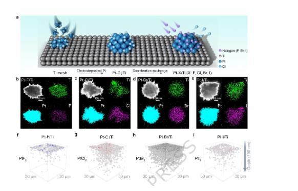 圖2、Pt-X/Ti(X:F,Cl,Br,I)的合成與表征。a.Pt-X/Ti合成過(guò)程的示意圖。b-f.(從左至右,上排)Pt-F/Ti,Pt-Cl/Ti,Pt-Br/Ti,Pt-I/Ti的EDS元素分布映射圖。g-i.(從左至右,下排)對(duì)應(yīng)的Pt-F/Ti,Pt-Cl/Ti,Pt-Br/Ti,Pt-I/Ti的3D TOF-SIMS圖像。