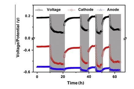 圖2.光暗交替條件下(陰影表示無光照,外接電阻=1000Ω)光微生物燃料電池電極電位(相對于Ag/AgCl)及電壓的變化情況。