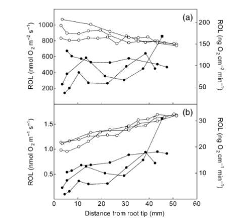圖3使用根套筒電極沿三條有(實(shí)心圓)或無(wú)(空心圓)鐵蝕斑的Lobelia dortmanna根長(zhǎng)度測(cè)量的徑向氧損失(ROL)。其中一個(gè)根的最基部某點(diǎn)(實(shí)心方塊)在其余部分完全覆蓋鐵蝕斑的情況下無(wú)鐵蝕斑。(a)中速率以nmol O?m?2根表面積s?1表示,(b)中以nmol O?m?1根長(zhǎng)度s?1表示,均為距根尖距離的函數(shù)。測(cè)量期間,根浸沒(méi)在去氧瓊脂中,且根腔隙基部暴露于大氣。