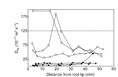 圖5三條有(實(shí)心圓)和無(wú)(空心圓)鐵蝕斑的Lobelia dortmanna根壁擴(kuò)散系數(shù)(Drw)沿根長(zhǎng)度的變化。其中一個(gè)根的最基部某點(diǎn)(實(shí)心方塊)在其余部分完全覆蓋鐵蝕斑的情況下無(wú)鐵蝕斑。水平虛線表示3.5°C時(shí)氧氣在水中的擴(kuò)散系數(shù)。