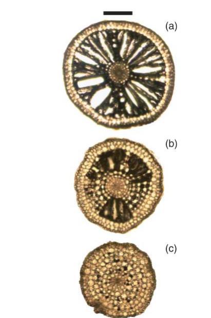 圖1無(wú)鐵蝕斑的Lobelia dortmanna根橫截面,位置分別為距根尖(a)30毫米、(b)13毫米和(c)3毫米處。組織孔隙度從根尖附近的約15%向根尖后30毫米處增加至約60%。比例尺:100微米。