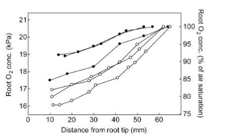 圖4三條有(實(shí)心圓)和無(wú)(空心圓)鐵蝕斑的Lobelia dortmanna根腔隙中的氧氣濃度隨距根尖距離的變化。氧氣濃度通過(guò)微電極內(nèi)部測(cè)量。測(cè)量期間,根浸沒(méi)在去氧瓊脂中,且根腔隙基部暴露于大氣。
