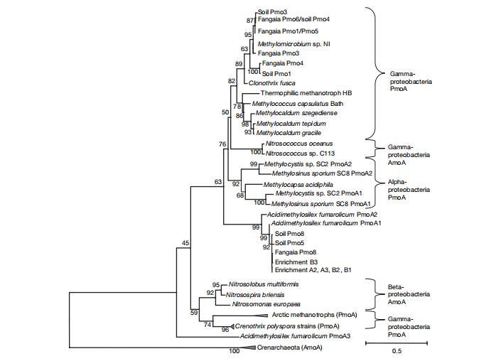 圖1|推導的PmoA和AmoA蛋白的系統發育關系。顯示了用PAM Dayhoff矩陣計算的鄰接樹,分支上顯示500次重復的bootstrap值。條形代表50%的估計序列分歧。應用不同的建樹方法顯示一致的樹拓撲。