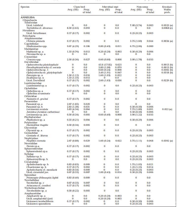 表1. 蛤床(cb)、微生物墊(mm)與非滲漏(ns)生境中大型動物(>300微米)在每個巖芯(54.08平方厘米×10厘米深度)的平均(標準誤)密度。采用Kruskal-Wallis檢驗分析微生物墊、蛤床與非滲漏生境間的差異,結果以卡方統計量表示。各分類單元概率值<0.05已標注,差異方向如下所示:(a)ns>cb+mm;(b)mm>cb+ns;(c)cb>ns+mm;(d)ns+mm>cb;(e)cb+ns>mm;Prop.:比例
