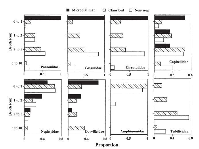 圖9. 常見環節動物在微生物墊、蛤床和非滲漏生境中的垂直分布。數據已標準化,每個垂直分層的數值代表每個科在所有樣本中采集的個體總數的比例。
