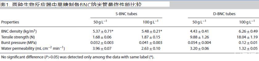 表1顯示了兩種生物反應器中培養14天,使用50 g L-1和100 g L-1果糖收獲的BNC管的性能。結果表明,用100 g L-1果糖制備的那些管具有更好的性能,并且用100 g L-1果糖制備的D-BNC管在所有管中表現出最佳性能。較高果糖濃度下的BNC密度總是大于用50 g L-1果糖制備的管,這應導致更強的拉伸強度、爆破壓和更小的透水性。與D-BNC相比,S-BNC管較弱的機械性能主要歸因于較低的BNC產量。數據明顯表明較高的果糖濃度賦予更好的性能。BNC密度和性能的這些多樣性可能意味著各種管的不同形態。因此,在以下進一步研究中比較了用100 g L-1果糖制備的BNC管的形態。