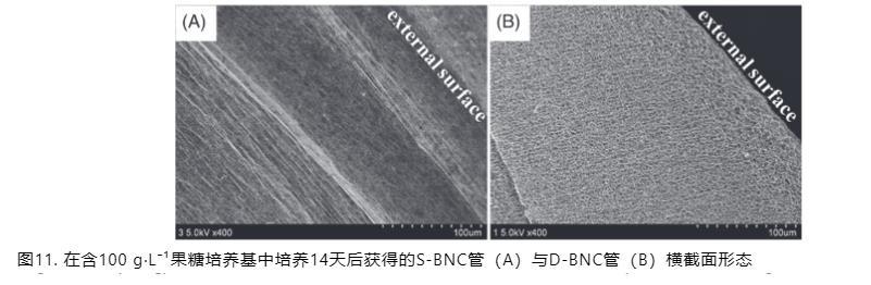 圖11展示了用100 g L-1果糖制備的BNC管的橫截面。如報道所述,13發現了S-BNC管的多層橫截面形態,但D-BNC管的橫截面顯示出未分層結構,具有均勻的多孔網絡,這與之前的發現一致。16 D-BNC管的均勻纖維網絡也可能有助于更強的拉伸強度和爆破強度。然而,結構差異背后的原因仍不清楚。Bodin等人13報道層狀部分的厚度隨O2量而變化。