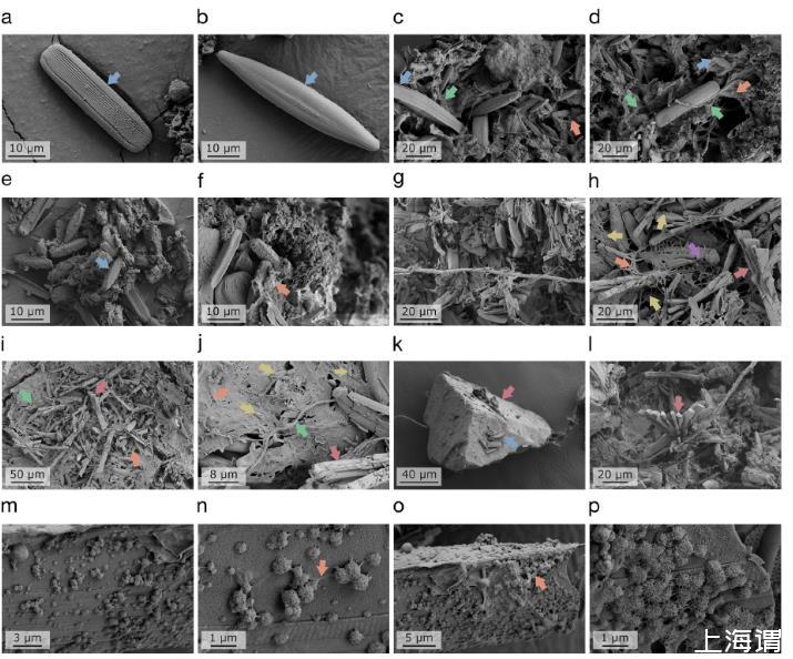 圖3、硅藻、藍細菌和其他原核生物可能參與Pozo Bravo微生物墊的石化過程。a-p顯示微生物墊樣品的掃描電子顯微鏡圖像;不同結構用箭頭標記:橙色表示EPS作為礦物沉淀的模板,紅色表示礦物結構,綠色表示絲狀藍細菌,黃色表示桿菌,紫色表示螺旋體,藍色表示硅藻(形態學鑒定的屬:a和b中的Navicula,c、d和k中的Halamphora,e中的Nitzschia)。