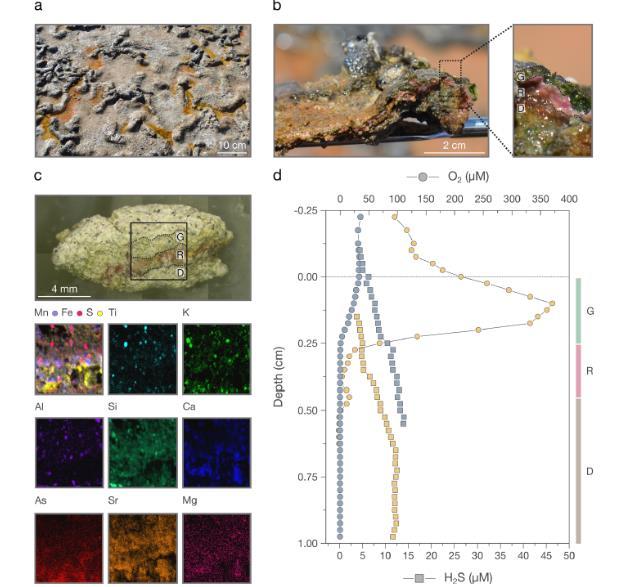圖2、Pozo Bravo微生物墊顯示其化學組成的空間和時間異質性。a)Pozo Bravo軟微生物墊的概覽,呈現腦狀或蛇狀結構。b)微生物墊橫截面的特寫,顯示綠色表層(G)、紅粉色中層(R)和深棕色底層(D)。c)通過μXRF光譜法測定的冷凍干燥軟微生物墊樣品中元素的空間分布(去卷積計數)。μXRF掃描區域(4.2 mm×4.3 mm)用黑色框標出,虛線突出綠色、紅粉色和深棕色層。d)在白天(13:00至16:00;黃色符號)和夜間(20:00至01:00)原位測量的氧和氫硫化物剖面。