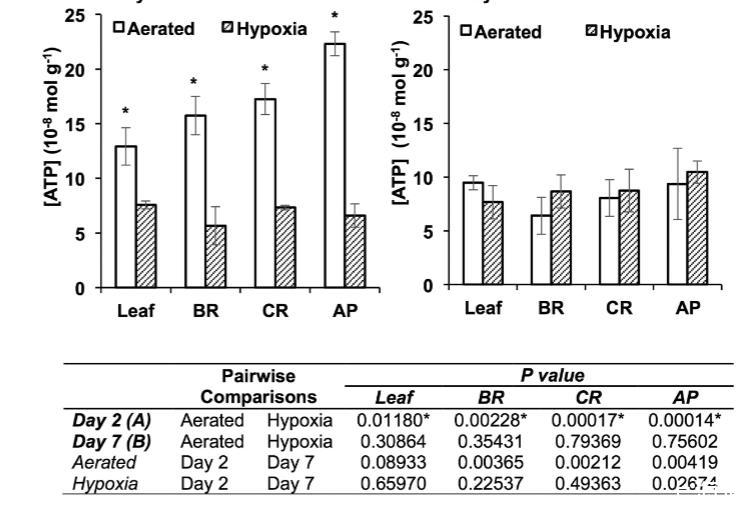 圖7.遭受低氧和通氣良好條件的煙草植株葉片以及根基部、根中部和根尖段的ATP水平。(A)處理2天后的ATP水平。(B)處理7天后的ATP水平。ATP水平通過檢測螢光素酶/螢光素反應中的生物發光信號來確定。星號表示同一天同一組織中通氣良好與低氧處理之間ATP水平的顯著差異;下表列出了第2天與第7天之間比較的P值(ANOVA,Tukey檢驗,P≤0.05,n=6±標準誤)。