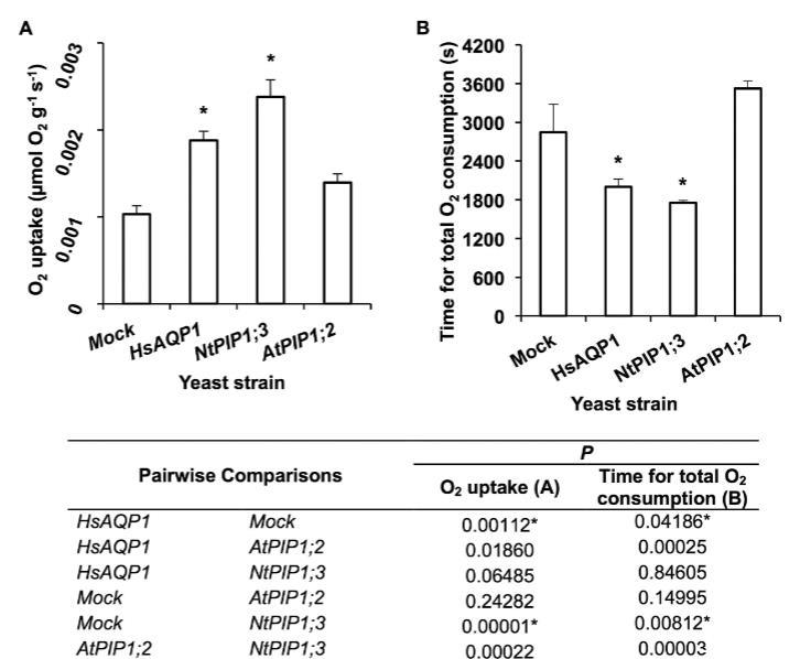 圖5.酵母菌株在1000秒內的氧氣消耗情況。(A)HsAQP1、NtPIP1;3、AtPIP1;2和模擬菌株(對照)的呼吸速率。(B)HsAQP1、NtPIP1;3、AtPIP1;2和模擬菌株(對照)的氧氣完全消耗時間。在向經氮氣鼓泡的SD-L-U+葡萄糖培養基中的酵母懸浮液供應空氣,使其可溶性氧氣濃度達到飽和濃度235μmol L-1后,立即使用氧氣微傳感器監測并每秒記錄酵母懸浮液中氧氣濃度的下降。星號表示與模擬菌株存在統計學顯著差異(下表顯示P值)(ANOVA,Tukey檢驗,P≤0.05,n=6±標準誤)。
